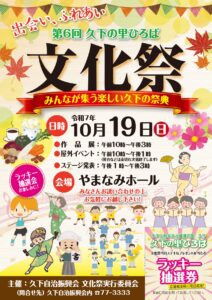 久下地区の皆様の参加と応援してくださる皆様のおかげで、6回目の文化祭を 10月19日(日)に、やまなみホールで開催します。 今回も山南中学校吹奏楽部や近畿大学生の参加で盛り上げていきたいと思います。 皆様のご来場をお待ち…