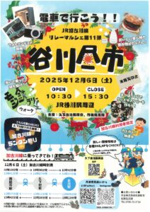 JR加古川線リレーマルシェ第11弾として、12月6日(土)に「谷川昼市」を開催します。加古川線でお越しの方には、金券などが当たる抽選会や松ぼっくりツリー作りの催しがあります。また、加古川線フォトコンテストやモジ鉄ウォーク…