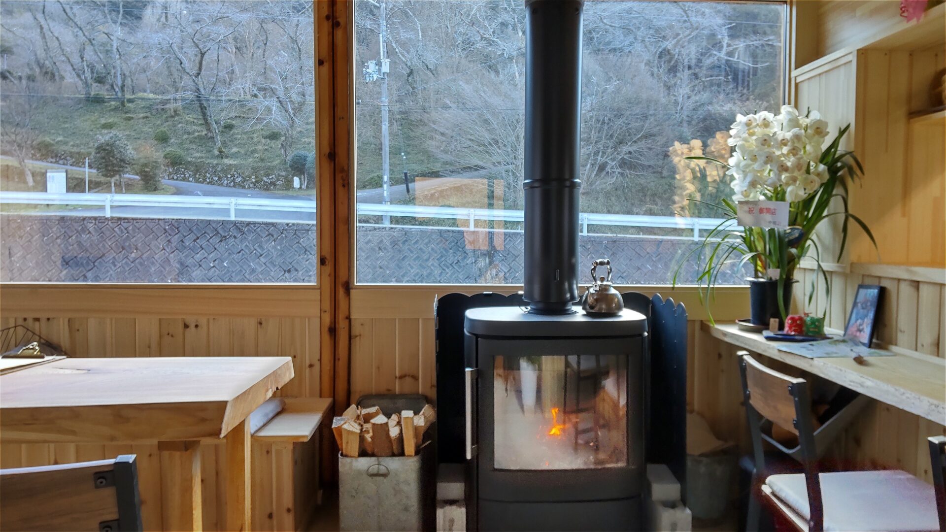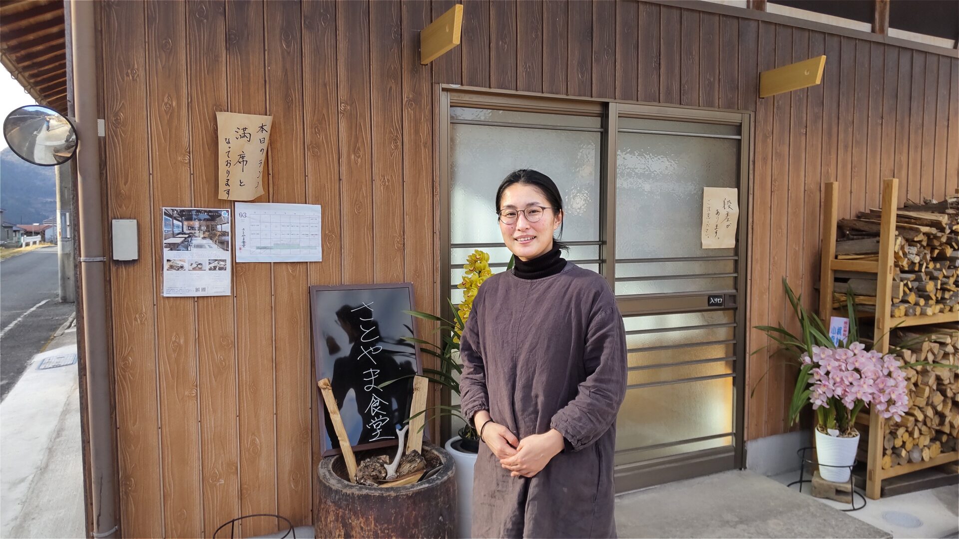 鬼こその開催日、2月11日には多くの参拝客が見込まれたため、お披露目を兼ねて仮オープンし賑わっていた。実家の駐車場として使っていた建物を改装工事。窓が広く薪ストーブも設置されゆったりとした気分で食事・お茶を楽しめる。春近しといえどもまだ寒い日が続いており、薪ストーブは活躍中。オーナーは藤本倫子(ふじもと ともこ)さん(41)。2011年3月11日の東日本大震災以降、食の安全への関心が高まり、その後の無農薬野菜を使った給食など、いろいろな活動・交流を通じて丹波の環境・魅力を発信したいとの思いが食堂オープンのきっかけに。食育、食べ物の安全性、環境問題等は重要なテーマであり、今後は特に調味料、食材、調理法にこだわりたいと抱負を語る。4人の母親として次世代に繋いでいきたい思いもある。